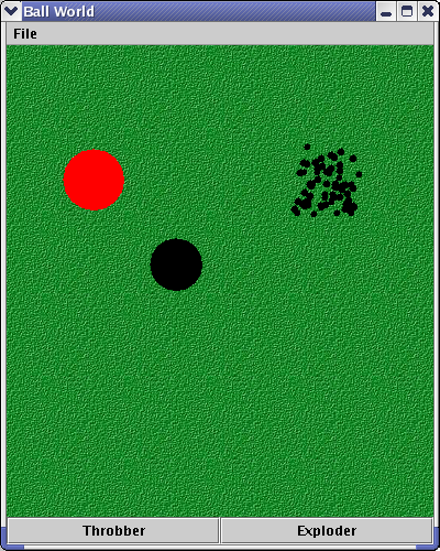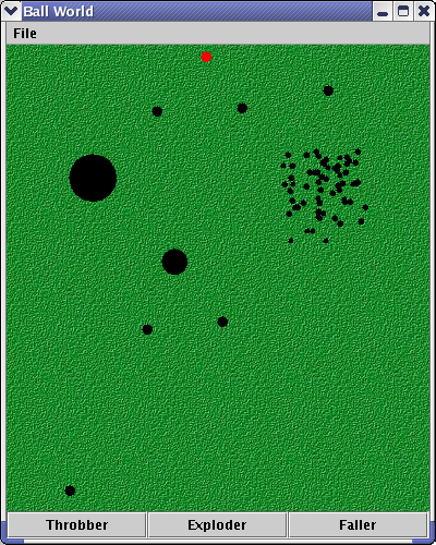 This image show the ball world with two Throbber balls (which change radius in and out) and an exploder ball which has explodded into a couple dozen balls. The upper left throbber is the currently selected ball so it is rendered in red.